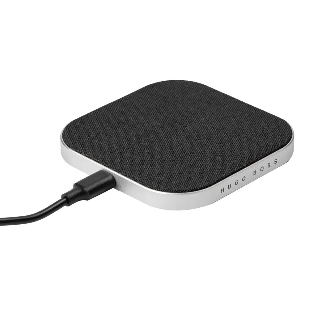 The Hugo Boss Wireless Charger combines refined design with efficient functionality. Featuring a sleek aluminium finish accented by elegant rounded corners and a discreet Hugo Boss logo, it offers a sophisticated charging experience. The fabric charging pad adds a premium tactile touch while ensuring device stability. Compact at 84 x 84 x 9.5 mm, it fits seamlessly into any workspace or bedside setup. The charger includes a 1-meter Type-C cable and user manual, all presented in a distinctive Hugo Boss gift box, making it ideal for personal use or as a premium corporate gift.