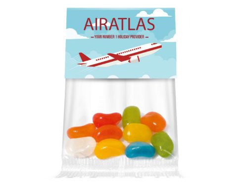 Add a vibrant splash of color and flavor to your next marketing campaign with Info Cards Jolly Beans! Perfect as a memorable giveaway at conferences and events, these treats not only delight with 20g of delicious Jelly Beans but also serve as a lasting promotional tool. Each heat-sealed clear bag is crafted from plant-based, 100% plastic-free, and compostable materials, reflecting your commitment to sustainability. The sturdy, recycled header card stands upright on desks, showcasing your brand and message in stunning UltraHD™ full-color print that captures attention long after the sweets are gone. Ingredients are clearly listed on the back, ensuring transparency. Elevate your brand presence with a fun, eco-friendly, and effective promotional item that leaves a sweet impression.