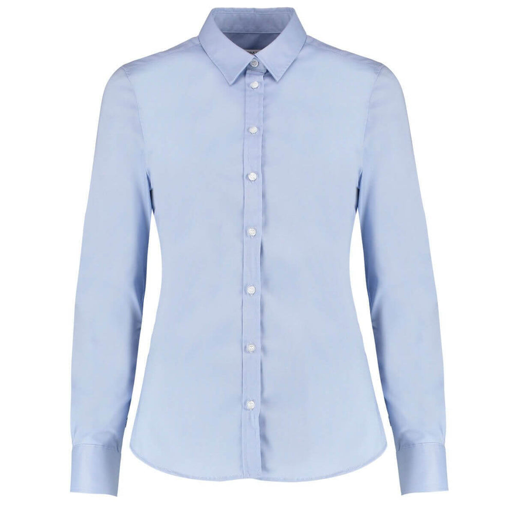 This tailored long-sleeved Oxford shirt features two darts at the back and bust for a precise fit, complemented by a fused stand-up collar that maintains its shape throughout the day. Crafted from a comfortable blend of 58% cotton, 39% polyester, and 3% lycra, it offers durability with a slight stretch for ease of movement. Available in sizes 6 to 20, it provides a professional and polished appearance suitable for a variety of settings.