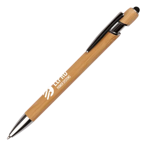 This eco-friendly bamboo ballpen with stylus combines sustainability with practical functionality. Its smooth bamboo barrel ensures a comfortable writing experience, while the silicone stylus tip offers precise, smudge-free navigation on digital screens. Equipped with a sturdy iron clip and ABS plastic trim, it delivers professional durability. Designed for recyclability once the bamboo is removed, this pen supports eco-conscious initiatives without compromising everyday usability. Ideal for businesses seeking a sophisticated, green promotional tool.