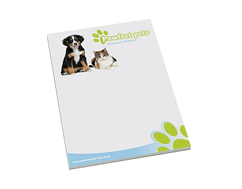Pawfect Pets A4 Notepads offer an exceptional way to keep your brand front and center with every note taken. Each notepad contains 50 sheets of 80gsm white, sustainably sourced paper, providing a smooth writing experience while supporting eco-friendly practices. The sheets are securely glued at the top edge, ensuring easy tear-off without mess. A sturdy board backing adds stability, making these notepads ideal for desks in offices, reception areas, or study spaces. Featuring vibrant UltraHD™ full-color printing, your logo and message will stand out brilliantly on every page. Proudly manufactured in the UK, these notepads combine quality, sustainability, and effective promotion in one practical product.