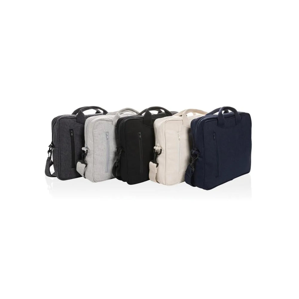 The recycled cotton laptop bag combines sustainability with professional design, tailored for 15.4-inch laptops. Made from durable recycled cotton twill, it features a padded laptop pocket secured with Velcro to protect your device. Practical front pockets enhance organization, while sturdy recycled canvas handles and an adjustable strap provide ergonomic comfort. Its compact dimensions of 5 x 34 x 39 cm make it an efficient and eco-conscious choice for everyday use.