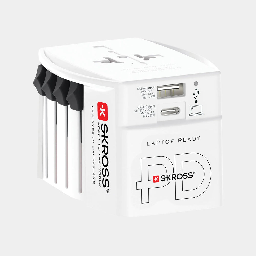 The S-Kross World Travel Adapter and USB C Cable offers versatile 65W power delivery through one USB-C port and one USB-A port, allowing you to charge your laptop, smartphone, and tablet simultaneously. Designed for convenience, it supports unearthed devices and includes a high-quality 65W USB-C cable for rapid laptop charging. Its compact design makes it ideal for travel, combining efficiency and portability in one reliable adapter.