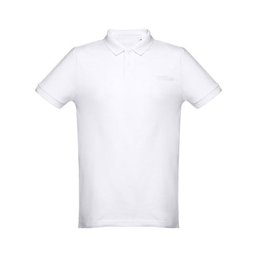This men's polo shirt features 100% carded cotton piqué fabric at 195 g/m² for durability and breathability. It has a refined piqué-reinforced collar and ribbed sleeves, complemented by a reinforced placket with two matching buttons plus an extra button sewn inside. The modern cut includes a single welted chest pocket and small side vents at the hem for ease of movement. Available in sizes S to XXL, it offers both comfort and polished style suitable for various casual occasions.